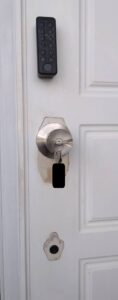 お客様が後付けしたスマートロックは使用したいとの事で、サムラッチから円筒錠へ